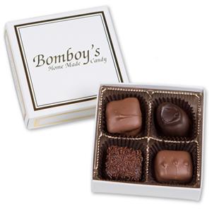A great gift for any occasion. This is a 4 piece box that consists of a Dark Chocolate Truffle, a Milk Caramel, a Milk Creamy Peanut Butter, and a Dark Vanilla Butter Cream. It makes for a great 'Thank You' gift.