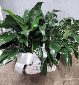 Two 6 inch pot spathiphyllum (peace lily) in a peanut basket with a pretty bow. Perfect for sympathy, new home or any occasion.