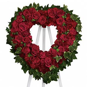 Red roses, spray roses, carnations and miniature carnations are arranged with fern and ivy in the shape of a heart.