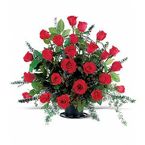 One funeral basket arrives decorated with twenty-four red roses and decorative foliage.