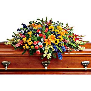 Full of light and love, this colorful casket spray celebrates a bright life with the natural beauty of hydrangea, roses, lilies and sunflowers.