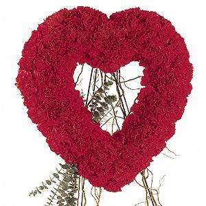 One open-center heart arrives on an easel covered with red carnations accented with curly willow and eucalyptus.