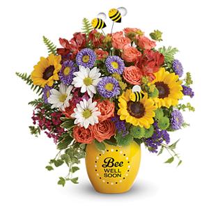 Wish them well with this bright, beautiful bouquet! From orange roses and red alstroemeria, to lavender asters and mini sunflowers, this rainbow of blooms will brighten their space - and their spirits. It's hand-delivered in a charming "Bee Well Soon" pot with darling bee decorations. Includes orange spray roses, red alstroemeria, lavender asters, yellow sunflowers, green button mums, white daisies, purple statice, pink sweet william, bupleurum, sword fern, leatherleaf fern, variegated pittosporum and ivy. Delivered in a Buzzing Bee Well pot. Orientation: One-Sided. Approx. Size: 14" W x 15" H.