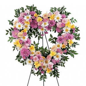 Created with lavender chrysanthemums, white daisies, yellow alstroemeria, pink asters and spray roses, delivered on an easel.