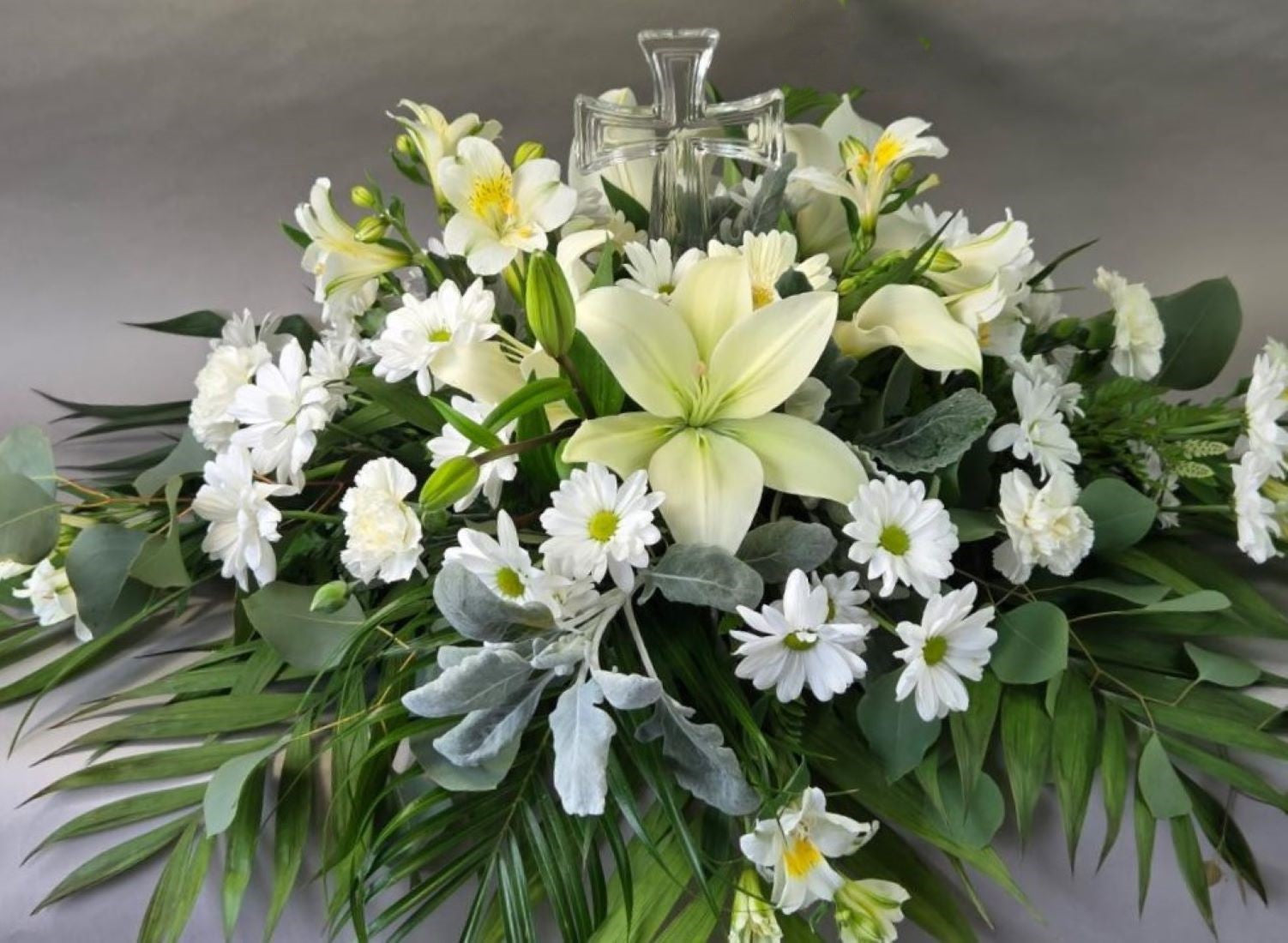 Small casket spray in all white flowers that include a crystal cross, the traditional symbol of the Christian faith.