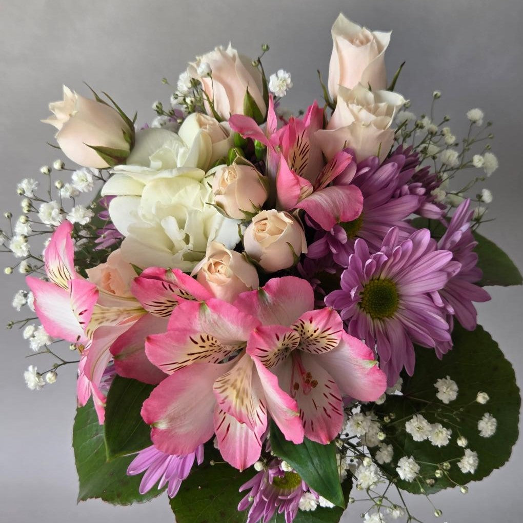 Add pink, lavender or white ribbon to wrap the stems of this hand held bouquet and