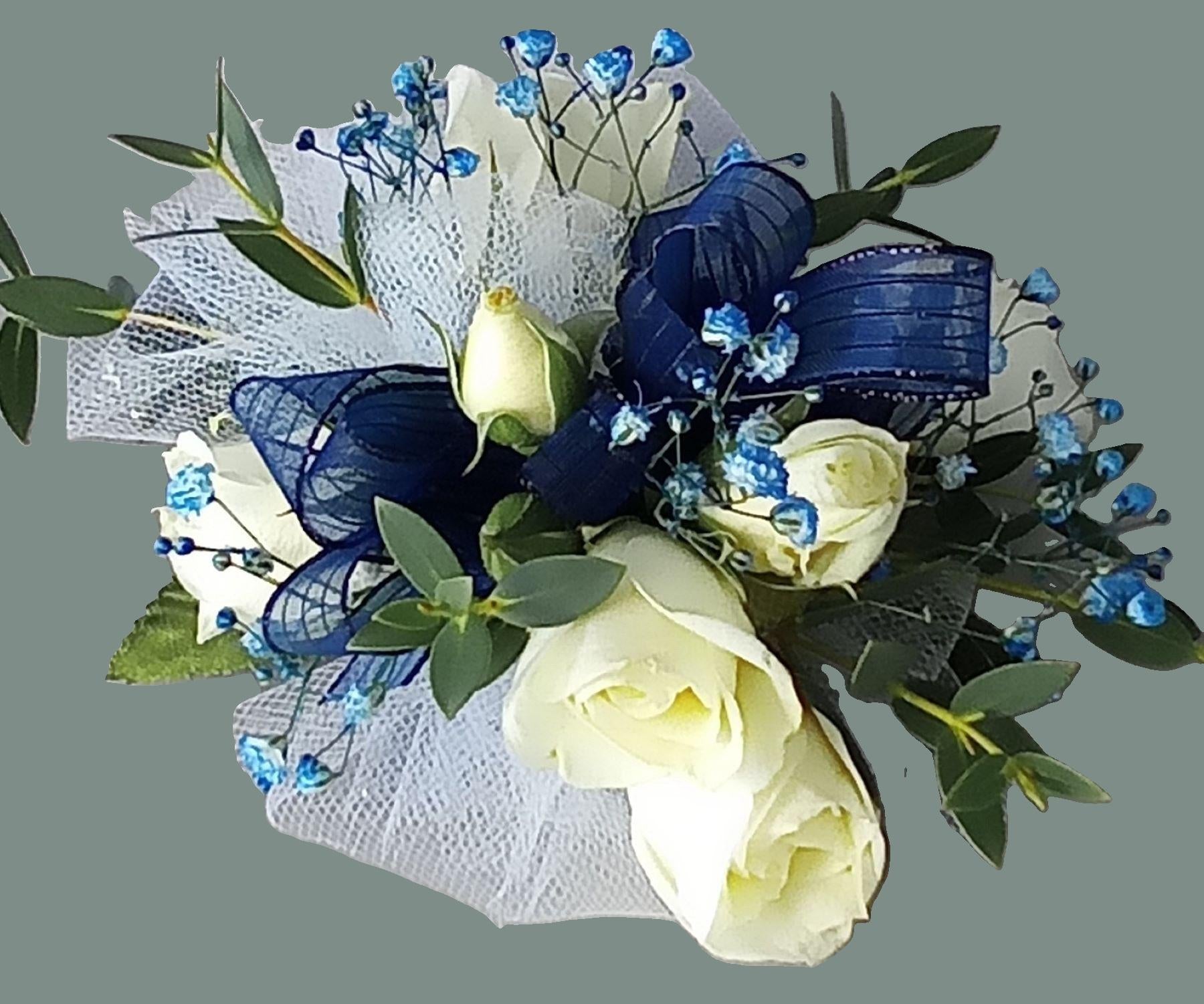 Our white spray rose wrist corsage with two roses added for total of seven. Includes a royal ribbon and royal tinted babies breath