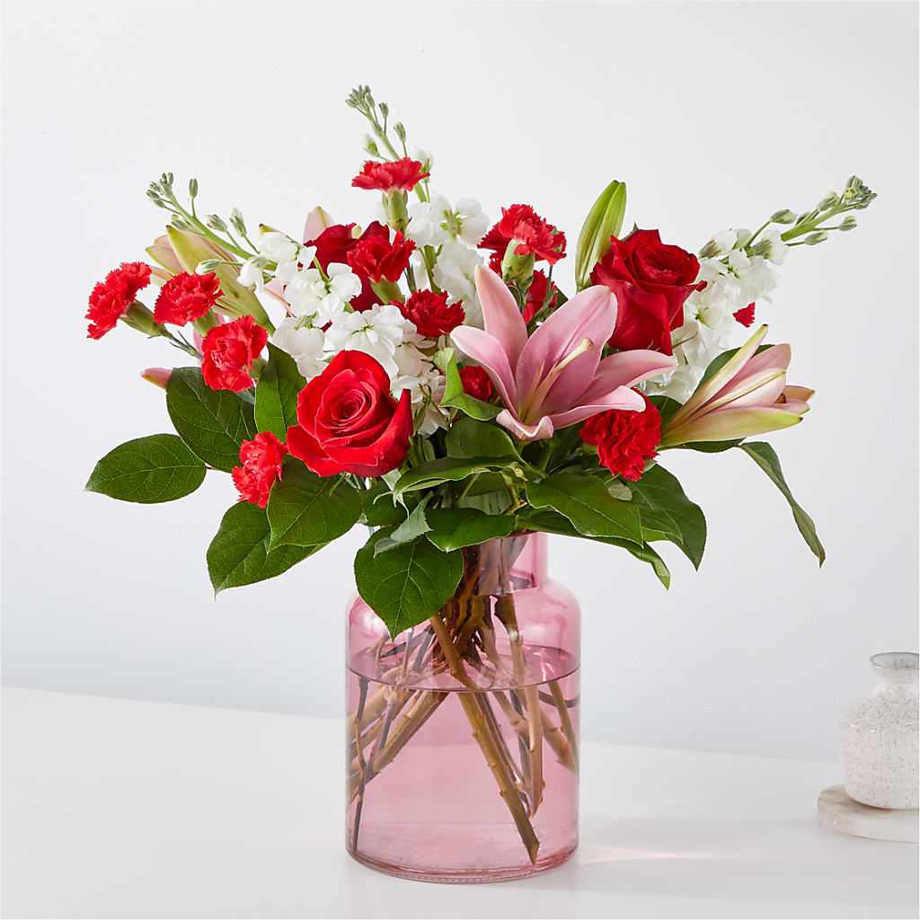 With an abundant blend of roses, carnations, and LA Hybrid lilies in a cinched glass vase, this captivating arrangement is sure to make them feel like they belong on the red carpet.